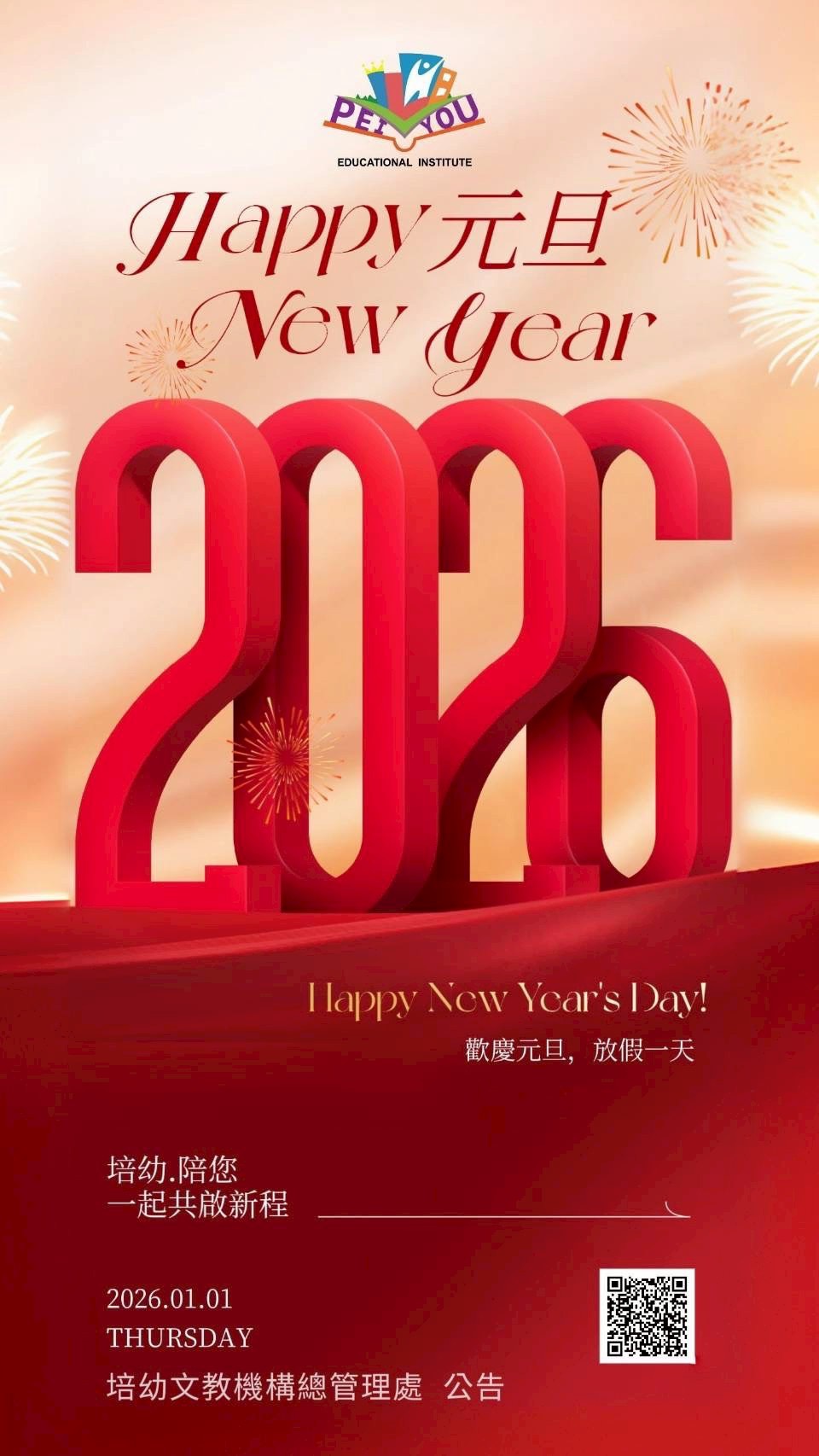 叮叮噹~新的一年要來囉!為了迎接充滿希望的 2025 年 ✨本園將於 1 月 1 日(星期四)元旦放假一天,讓老師和寶貝們一起充電、迎接新開始 🔋💖